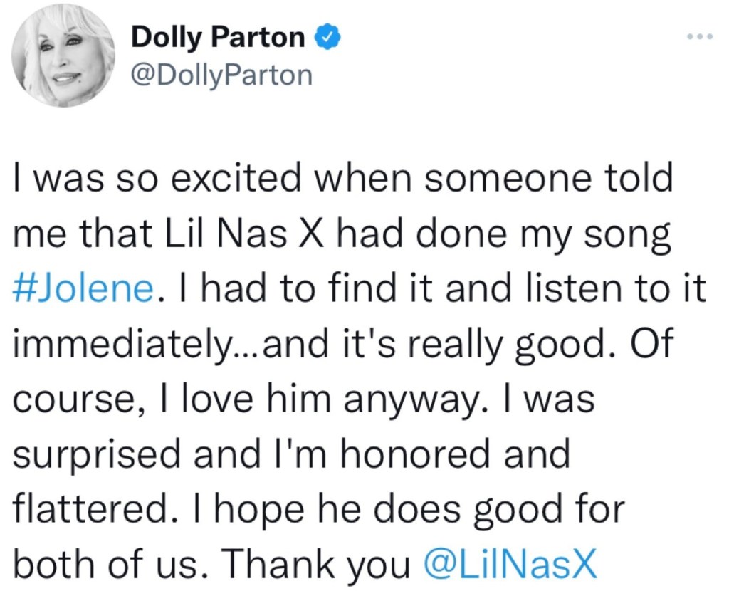 Dolly Parton reacts to Lil Nas X covering her song “Jolene”:“I had to find it and listen to it immediately…and it’s really good. Of course, I love him anyway. I was surprised and I’m honored and flattered. I hope he does good for both of us. Thank you LilNas